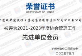 喜報丨中道明華建設項目咨詢集團有限責任公司瀘州分公司榮獲“2021-2023年度協會管理工作先進單位會員”